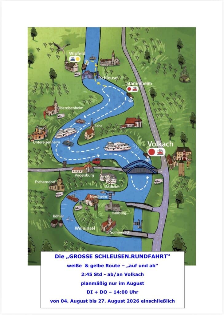 Bei der „GROSSEN SCHLEUSEN.RUNDFAHRT“ – dienstags und donnerstags – im August, passieren wir die SCHLEUSE WIPFELD in der Bergfahrt. Innerhalb von 15 Minuten werden wir 4,30 m gehoben. Am Anleger 317 – WIPFELD (rechtes Mainufer) – legen wir zu einem kurzen ZWISCHENSTOPP an. Hier können Gäste aus- und zusteigen, bevor wir wieder wenden, abgeschleust werden und zurück nach Volkach fahren (siehe weiß-gelbe Routen.Markierung auf nebenstehender Karte).